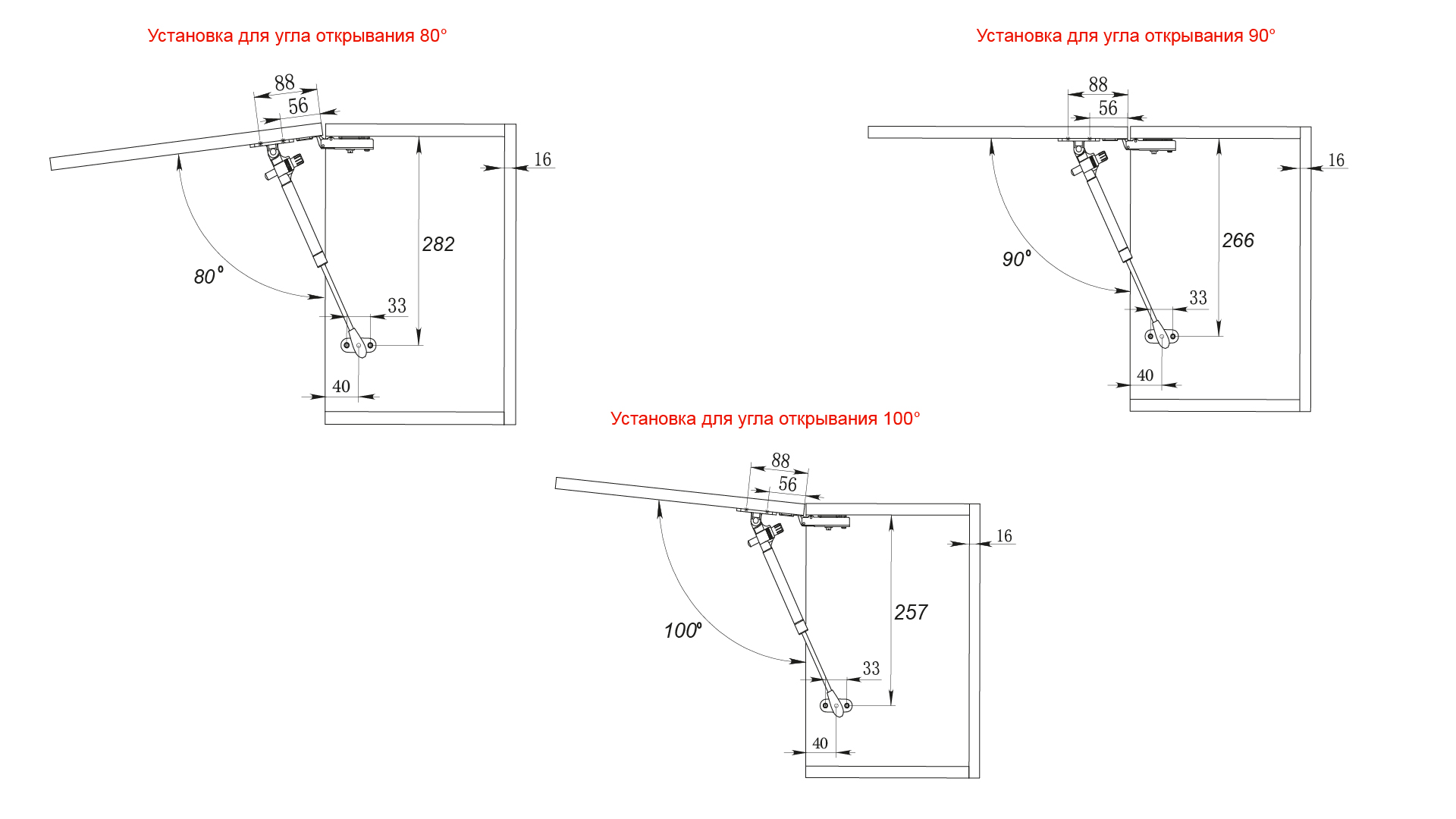 Газовый лифт поставляется в комплекте с шаблоном-инструкцией для установки, которая поможет легко и быстро произвести монтаж, а также и выбрать угол открывания фасада 80°, 90° или 100°.