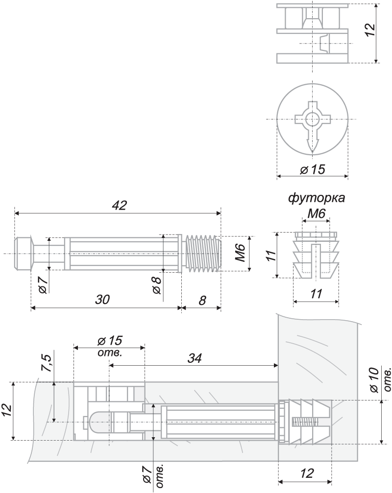 —Эксцентрик 15х12мм дюбель с метрической резьбой М6, футорка (для плит от 16мм)(вывод)