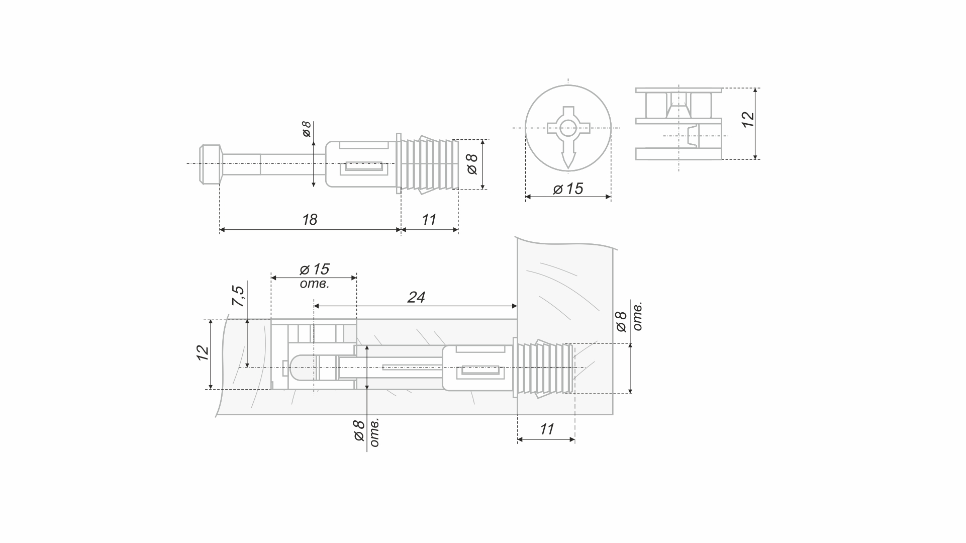 Эксцентрик 15х12мм дюбель БМ d8 мм со сверлом под эксцентрик на расст. 24мм (для плит от 16мм)