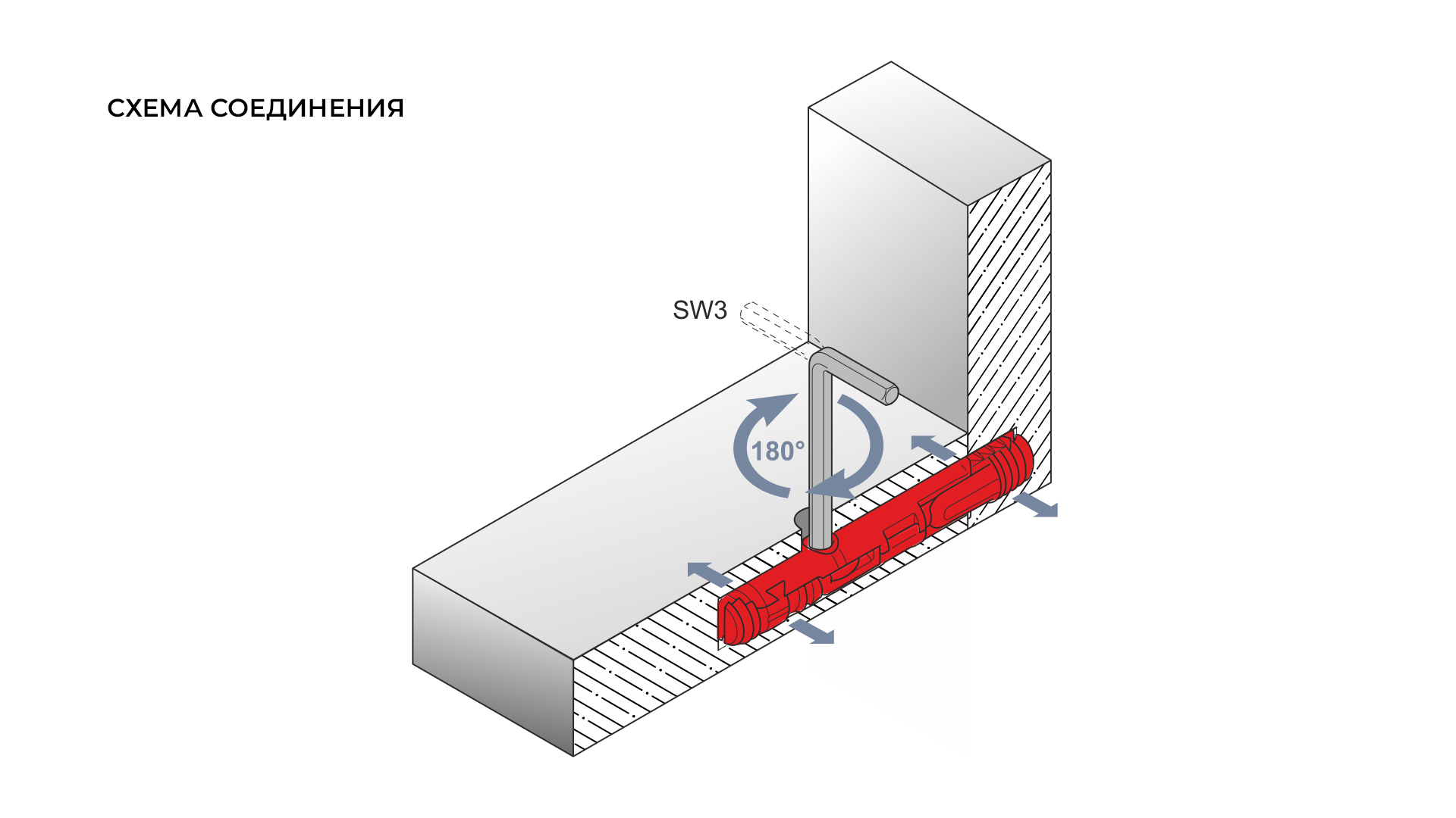 Для корректного монтажа стяжки потребуется просверлить отверстие на поверхности первой стыкуемой плиты в пласти и еще одно в торце второй. Затем обе детали стягиваются между собой при помощи Г-образного ключа-шестигранника 3 мм (приобретается отдельно).
