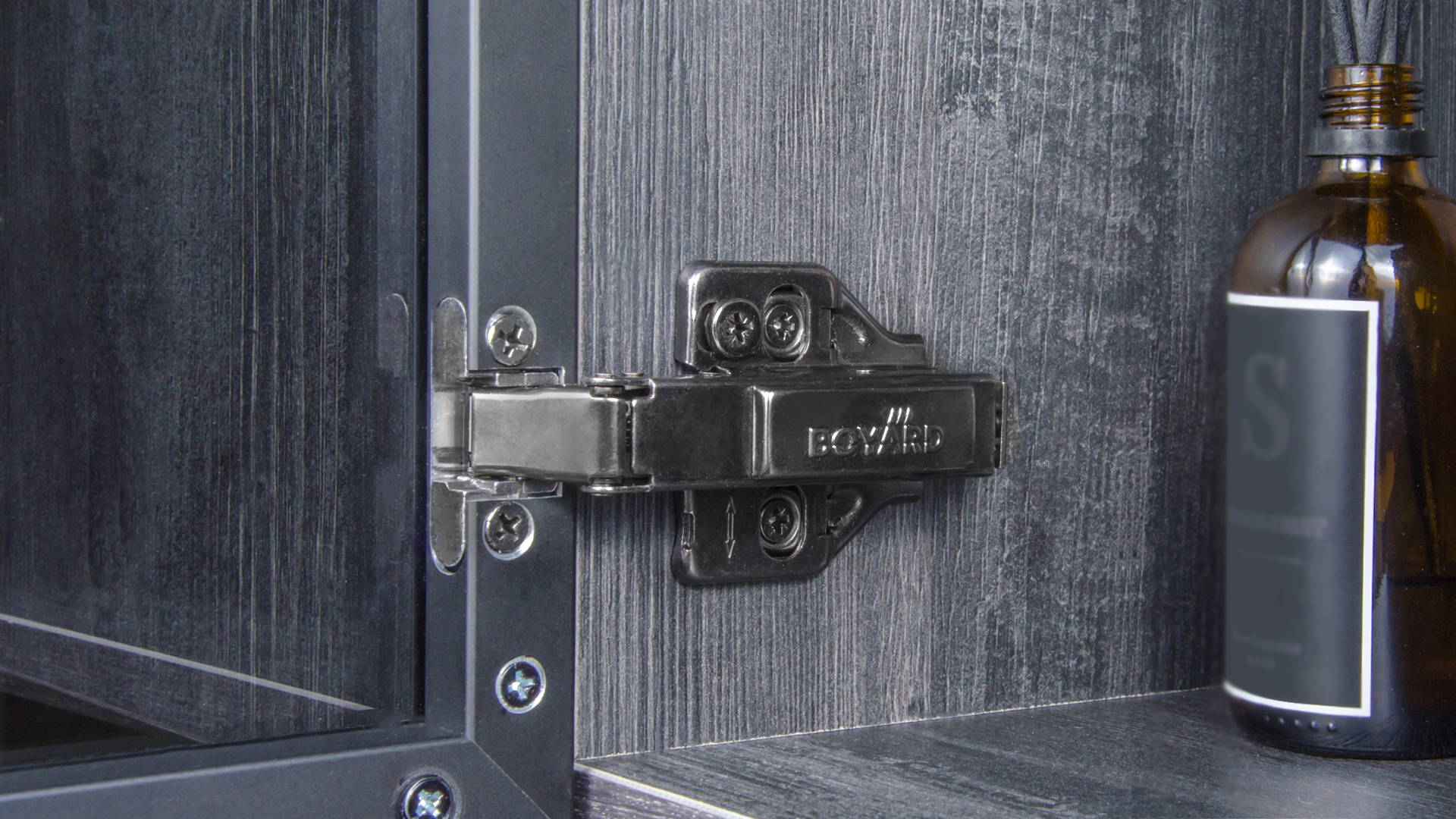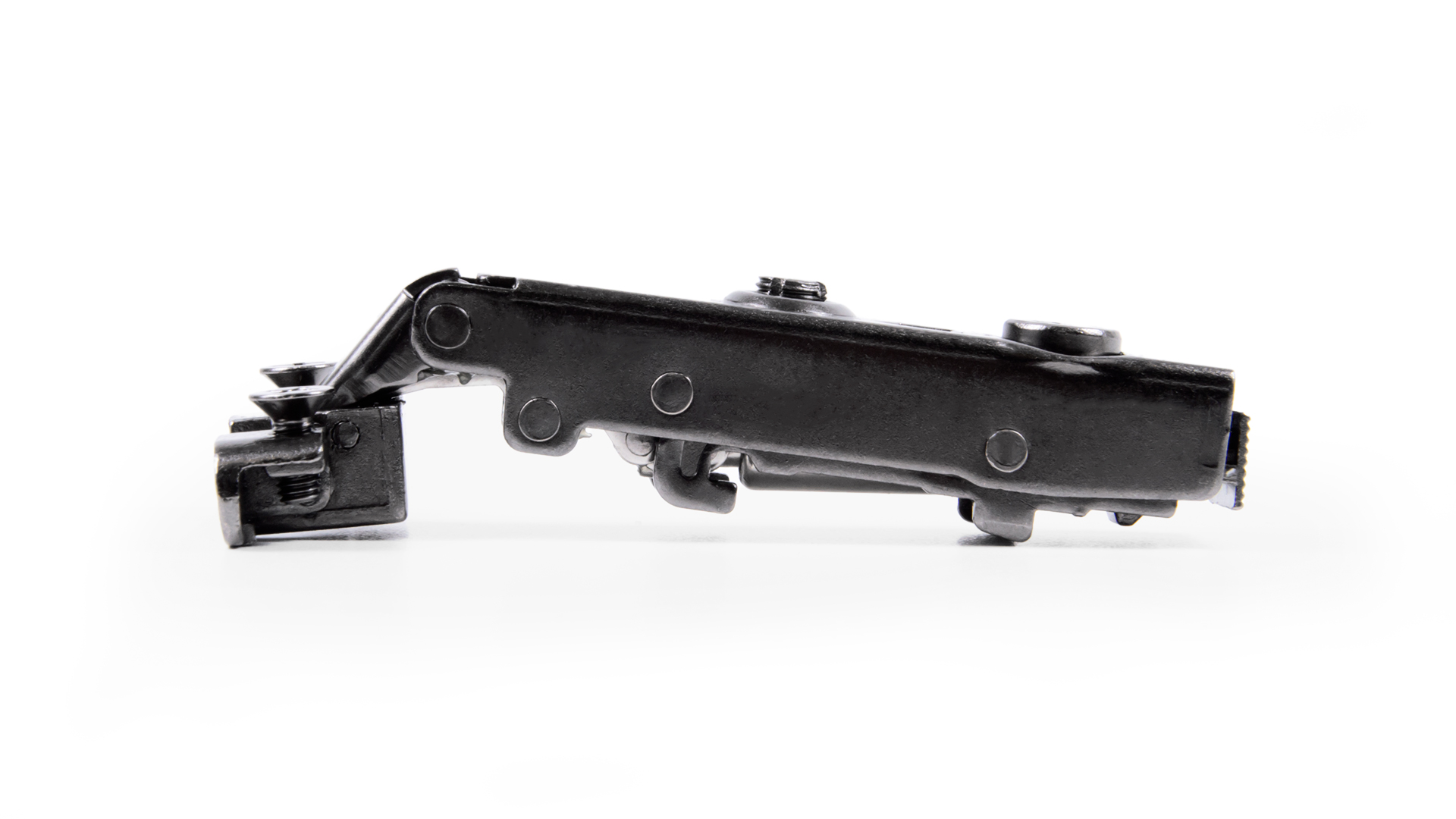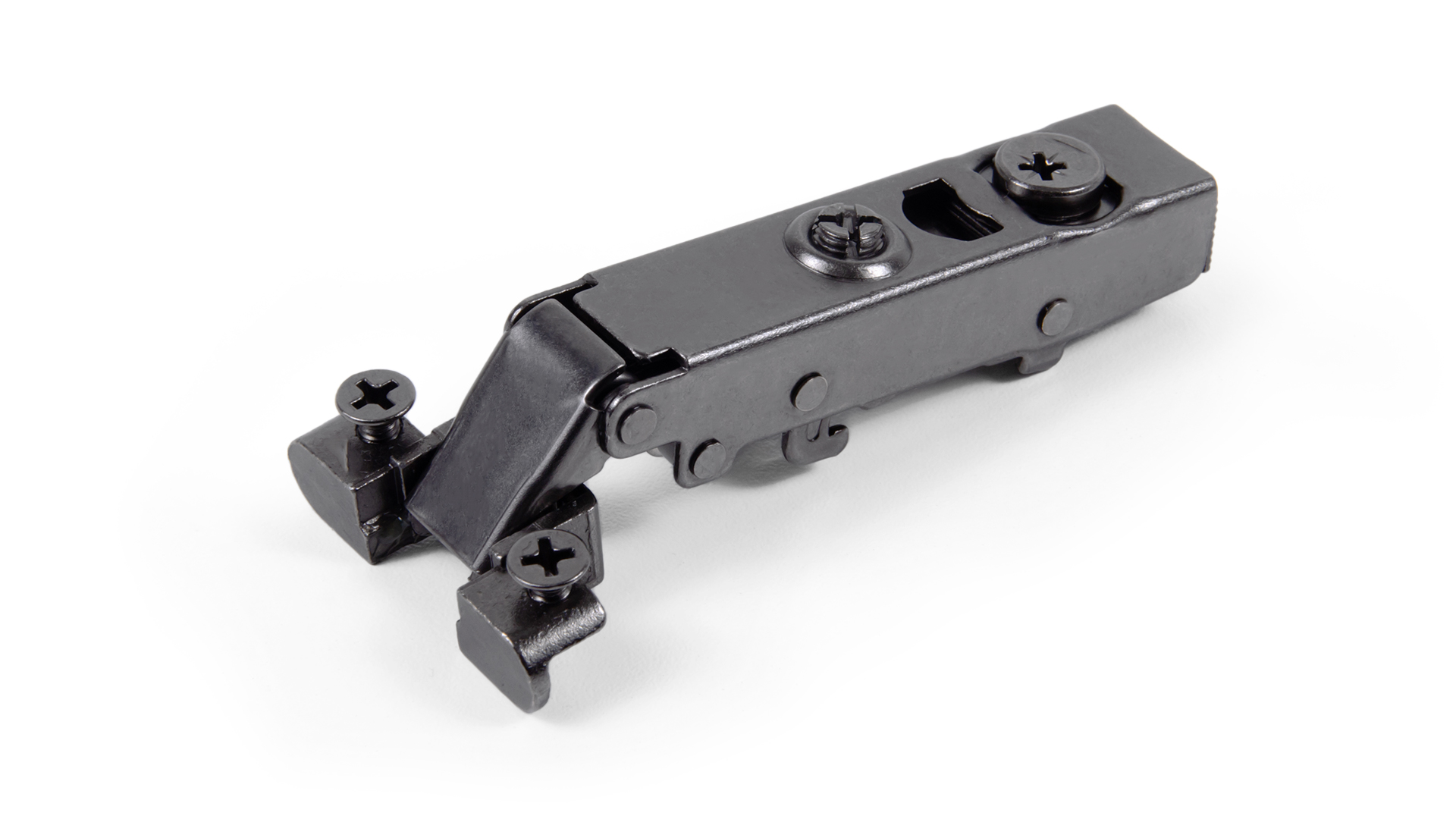 Модель быстрого монтажа Clip-on, имеет регулировку фасада в трёх плоскостях (по глубине, горизонтали и вертикали). Удобная регулировка по высоте и глубине в одно действие осуществляется при помощи эксцентрикового винта, встроенного в корпус петли. Регулировка фасада по горизонтали доступна при помощи винтов на планке.
