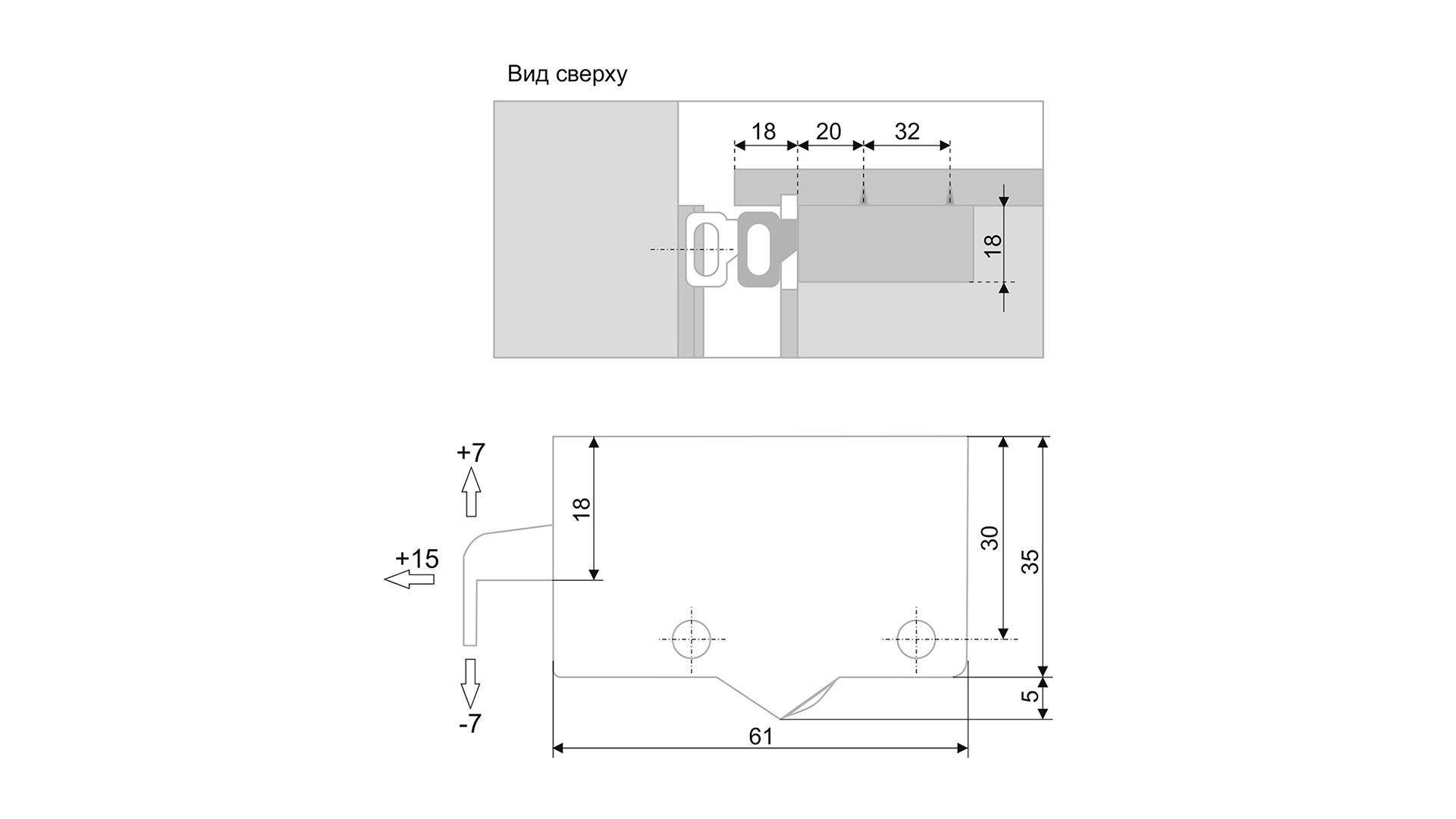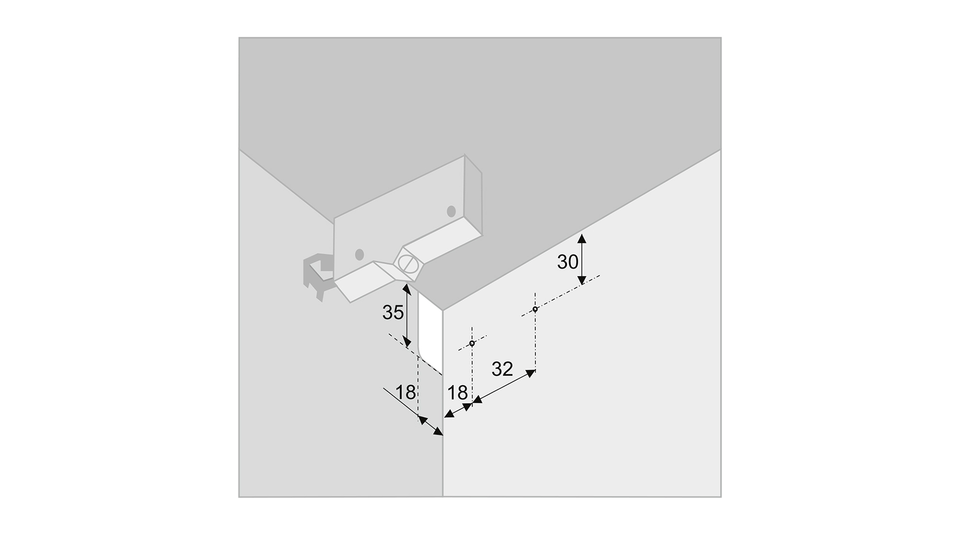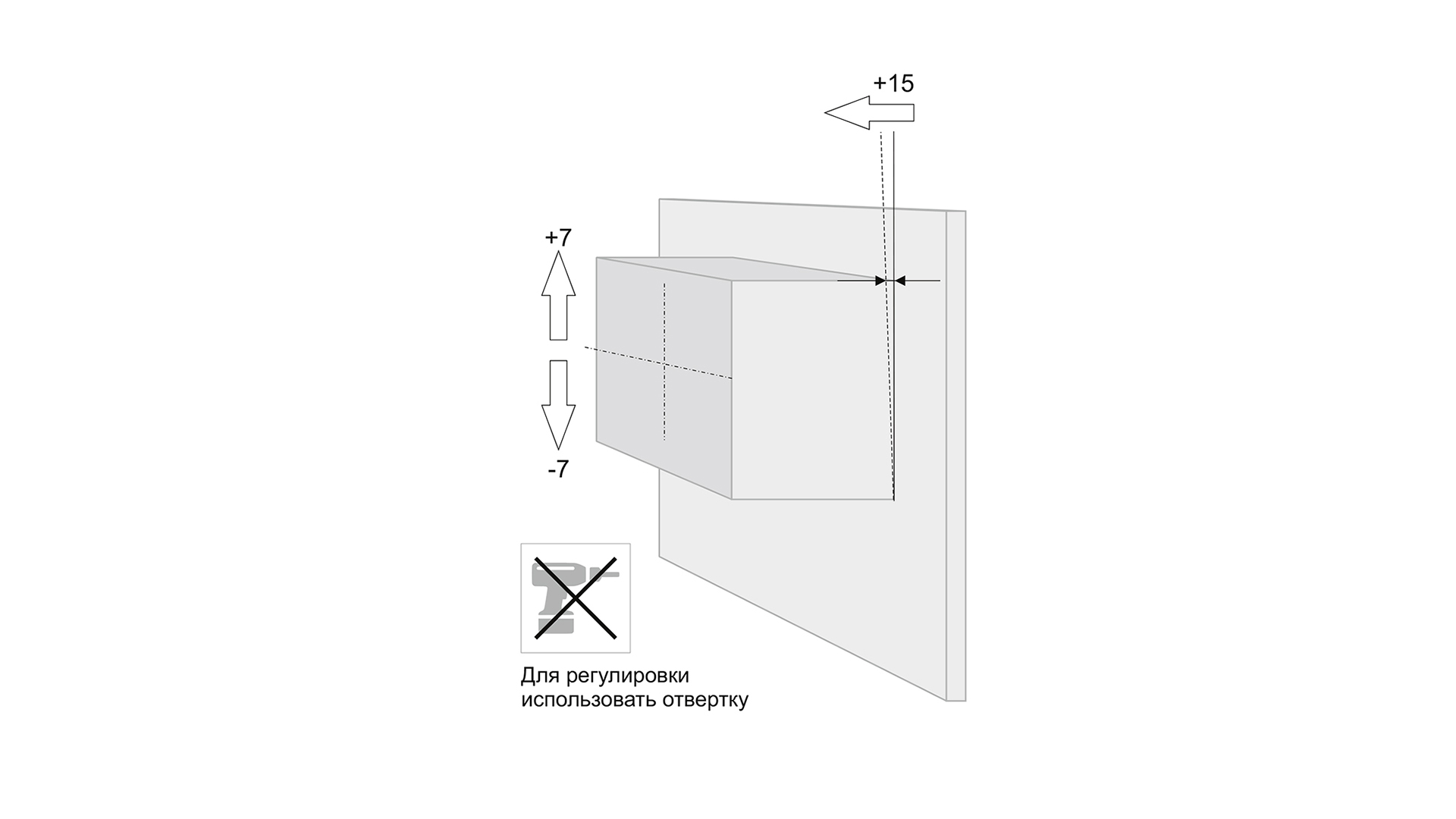 CH06 можно монтировать как к левой, так и к правой боковине корпуса. Модель позволяет отрегулировать смещение мебельного корпуса по вертикали +/- 7 мм, и по горизонтали от плоскости стены + 15 мм.