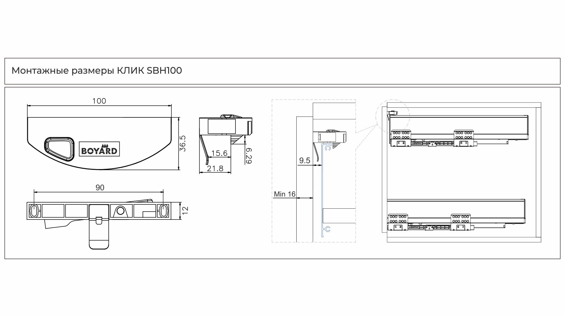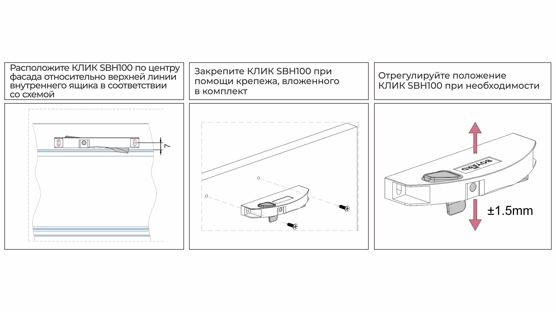 КЛИК SBH100 в своей конструкции имеет специальный «усик», создающий небольшой преднатяг, препятствующий сильному столкновению внутреннего ящика с фасадом основного ящика.