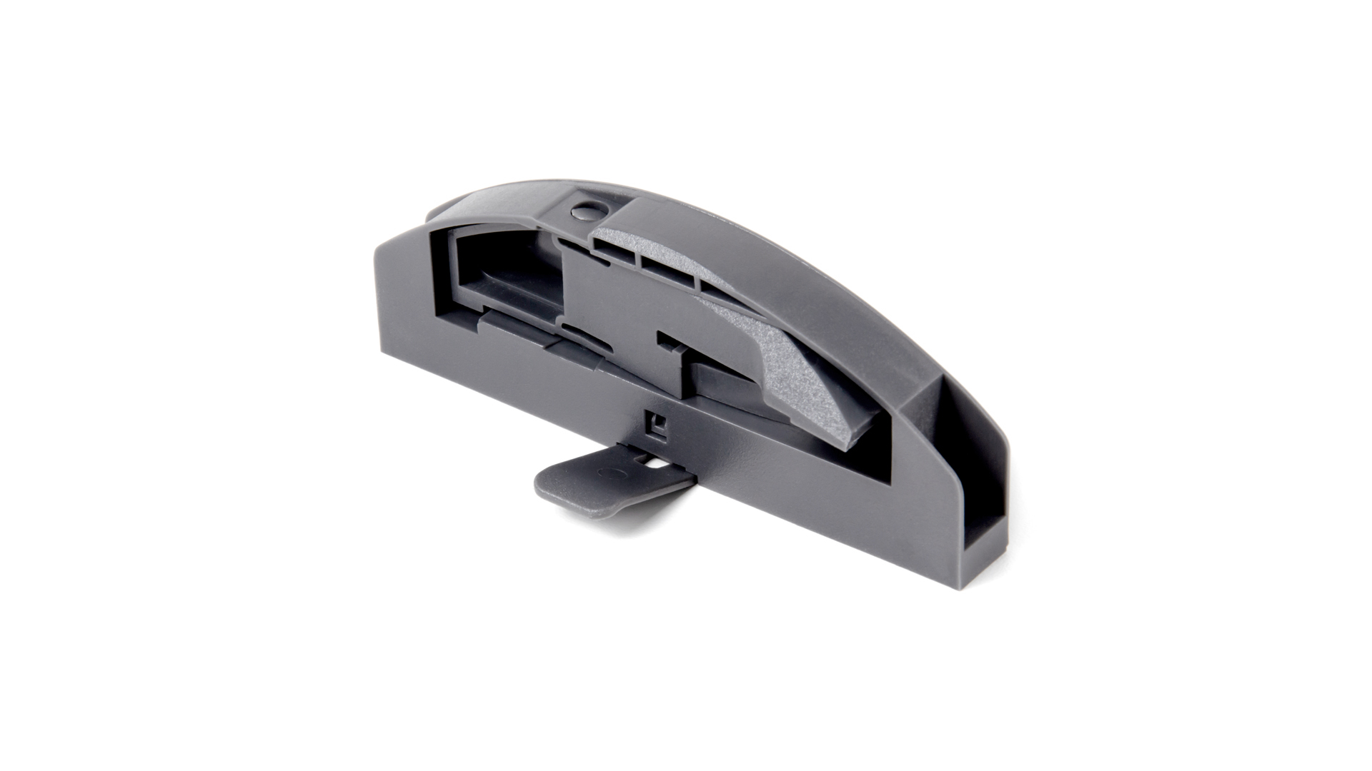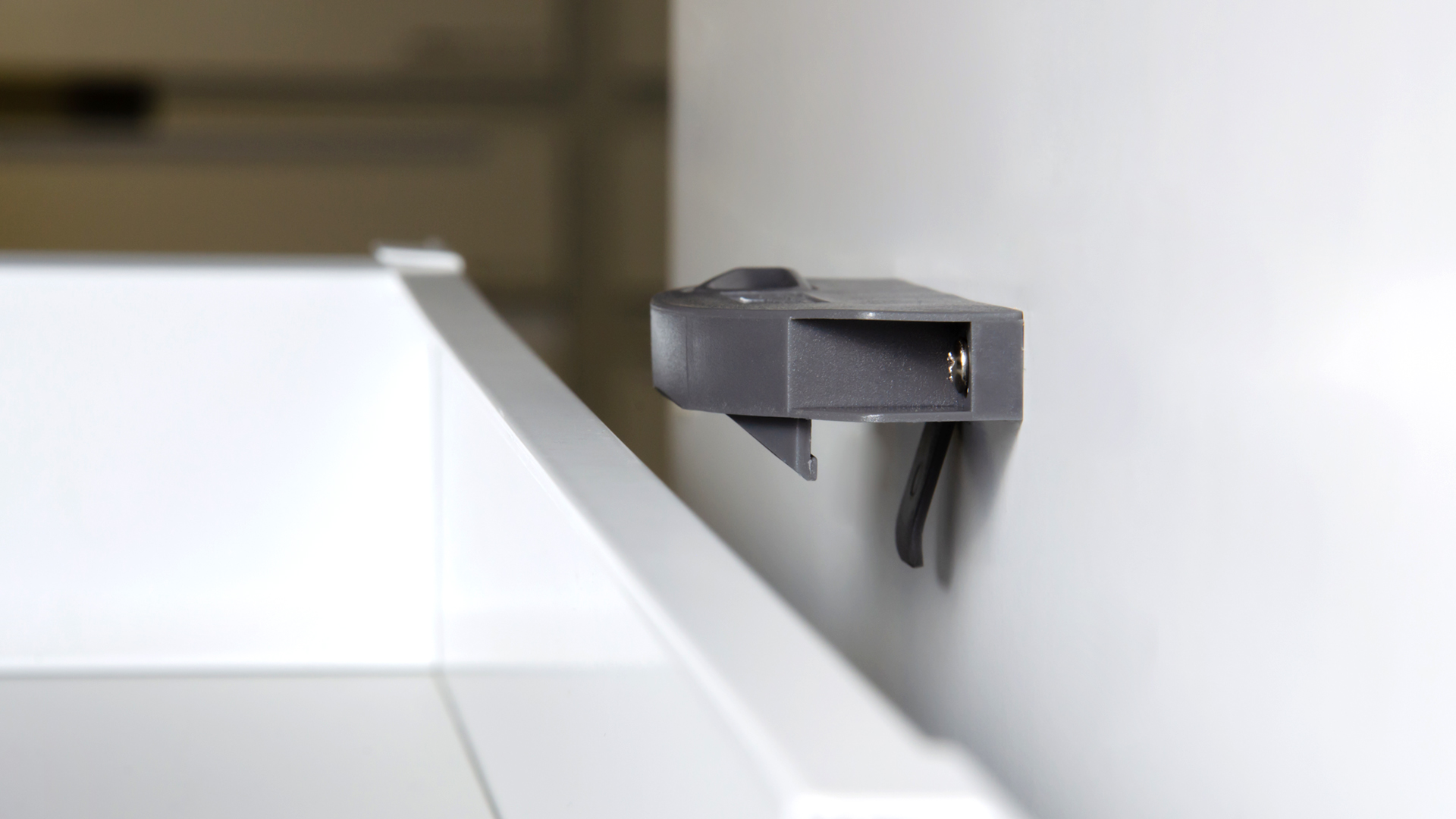 Держатель легко закрепляется на саморезы (идут в комплекте держателем) с обратной стороны фасада, и надёжно фиксирует внутренний ящик, а одним нажатием кнопки отпускает его.