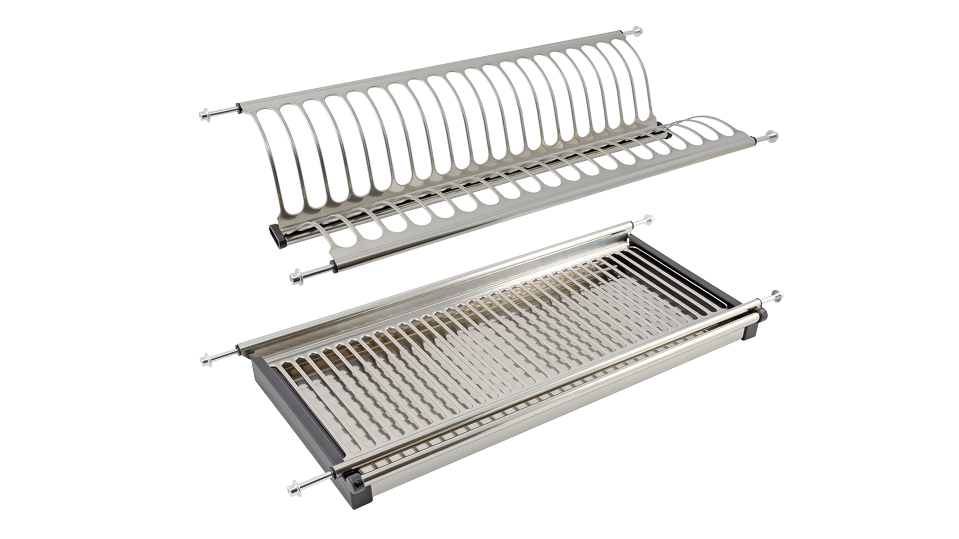 Двухуровневая сушка для посуды быстрого монтажа для современных кухонных гарнитуров позволяет размещать значительное количество вымытой посуды. Модель оснащена стальным поддоном для сбора стекающих с посуды капель воды. Одно из достоинств сушки – быстрый монтаж: конструкция монтируется в предварительно просверленные отверстия. Материал конструкции – нержавеющая сталь и пластик.