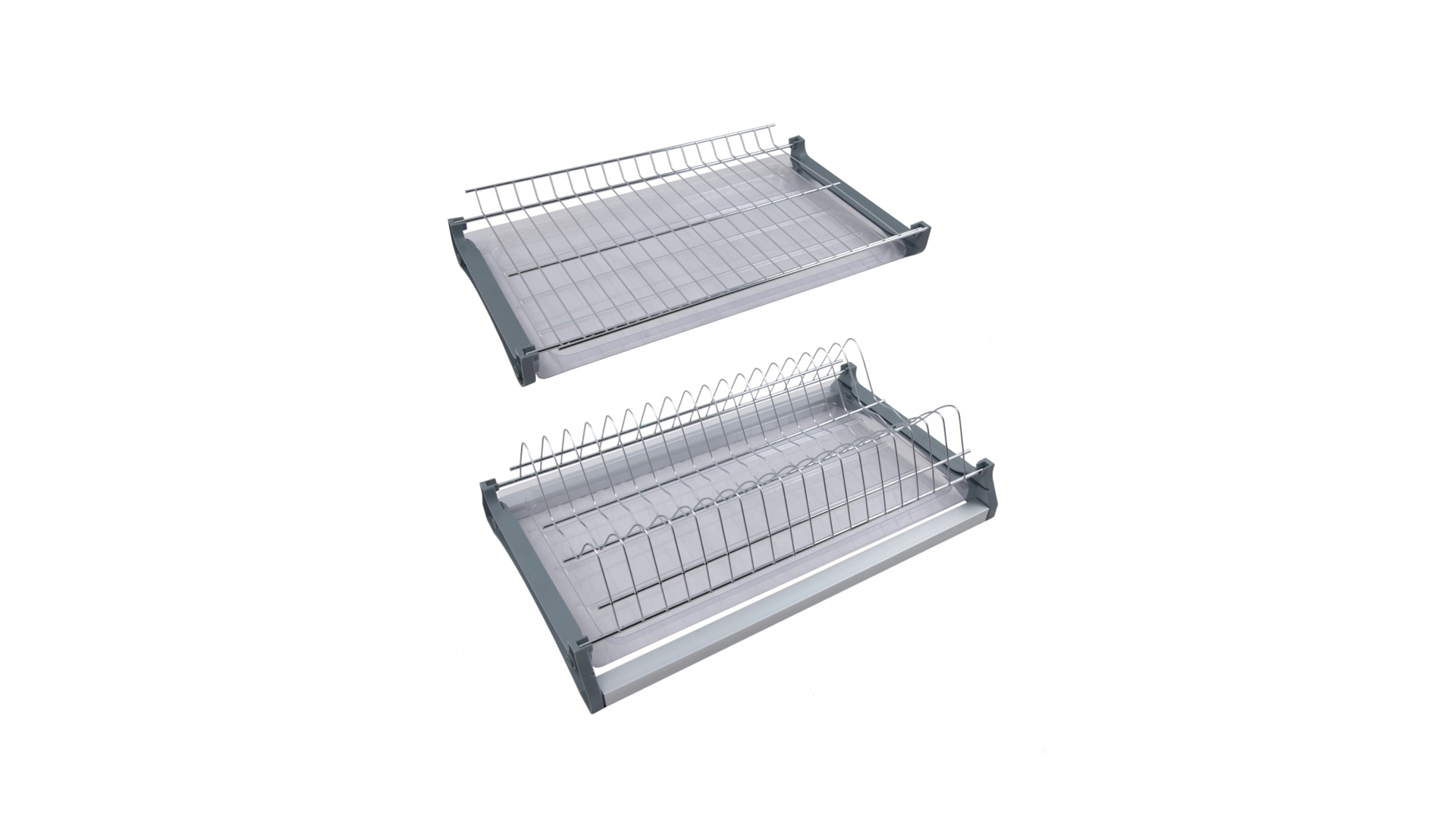 Комплект сушки включает 2 яруса для хранения посуды с надёжным гальваническим покрытием с эффектом хромирования, 2 съёмных поддона из качественного бесцветного пластика, 4 пластиковых серых держателя нижнего и верхнего уровней, переднюю и заднюю алюминиевые трубки, саморезы для монтажа сушки и крепления трубки.
