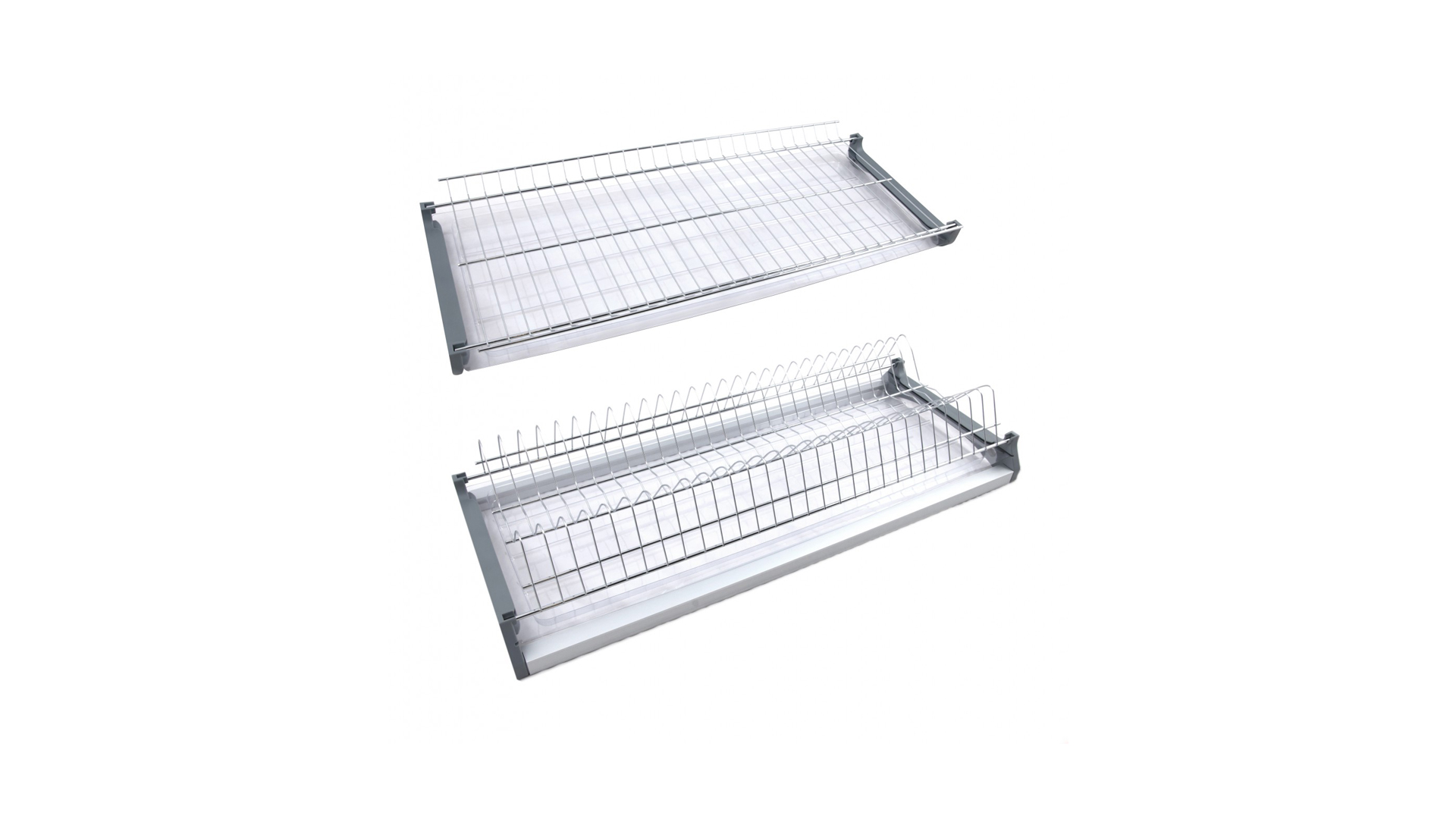 Комплект сушки включает 2 яруса для хранения посуды с надёжным гальваническим покрытием с эффектом хромирования, 2 съёмных поддона из качественного бесцветного пластика, 4 пластиковых серых держателя нижнего и верхнего уровней, переднюю и заднюю алюминиевые трубки, саморезы для монтажа сушки и крепления трубки.