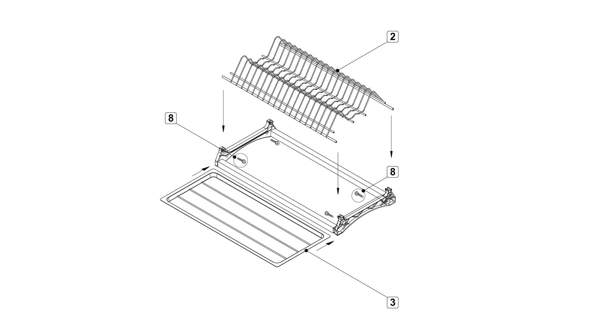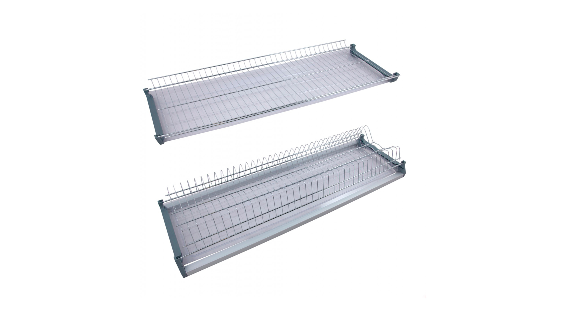 Комплект сушки включает 2 яруса для хранения посуды с надёжным гальваническим покрытием с эффектом хромирования, 2 съёмных поддона из качественного бесцветного пластика, 4 пластиковых серых держателя нижнего и верхнего уровней, переднюю и заднюю алюминиевые трубки, саморезы для монтажа сушки и крепления трубки.