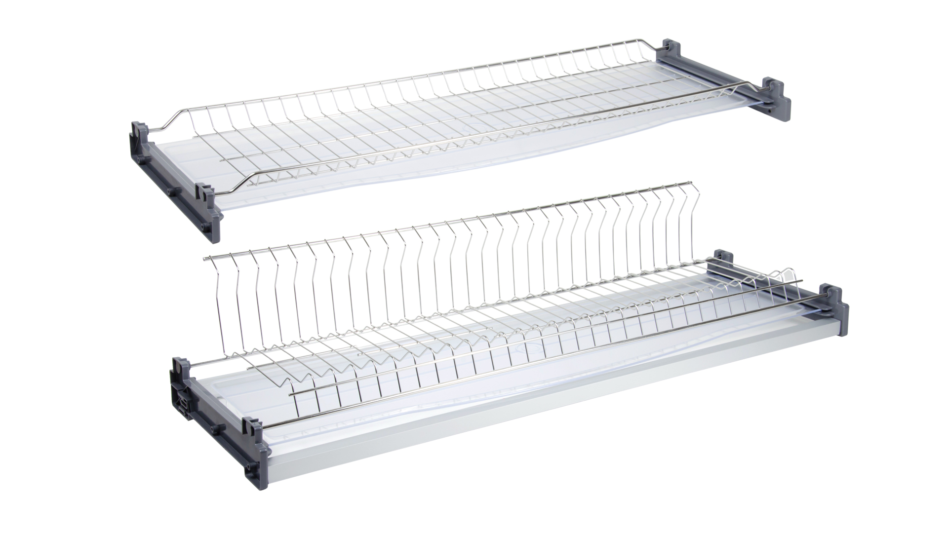 В комплект входит: 2 уровня сушки (решётка для кружек и L-образная решётка для тарелок), 2 пластиковых поддона, 2 комплекта пластиковых держателей нижнего и верхнего уровня, 2 соединительных трубки, саморезы M4x20 – 10 штук, 3,5х8 – 4 штуки.
