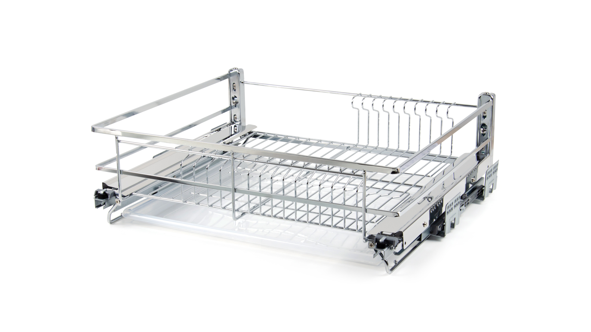 MIRA KRS06 — выдвижная корзина-сушка в эксклюзивном дизайне с плоским прутком с амортизацией, предназначена для хранения разноплановой посуды в нижней базе мебельного гарнитура.