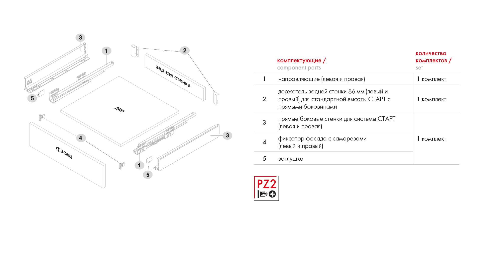 СТАРТ SOFT SB18 — комплект систем выдвижения для сборки выдвижного мебельного ящика с прямыми боковинами стандартной высоты 86 мм для минимальной высоты проёма 115 мм. Комплект включает в себя направляющие, прямые боковины, держатели фасада и задней стенки, заглушки с логотипом BOYARD и необходимый крепёж.