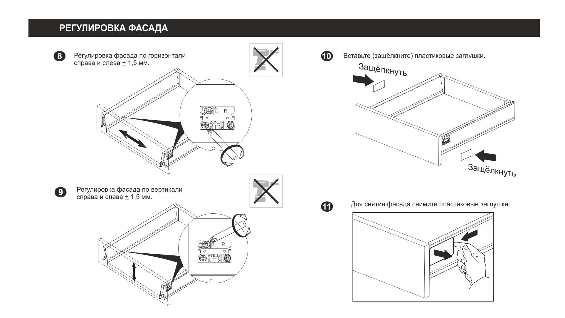 Конструкция СТАРТ PUSH SB28 имеет регулировочный красный винт — он позволяет выровнять фасады по глубине и компенсировать погрешности производства и монтажа. Специальные риски на направляющей помогут выставить одинаковое положение регулировки на обеих направляющих (левой и правой).