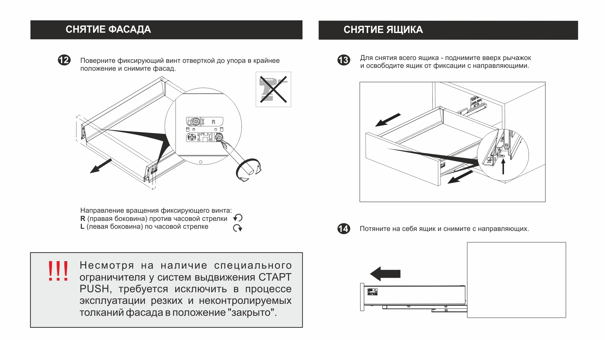 Система СТАРТ PUSH обеспечивает полное выдвижение после нажатия на фасад. Направляющие системы оснащены зубчато-реечным механизмом синхронизации, обеспечивающим равномерный ход и исключающим перекосы при движении.
