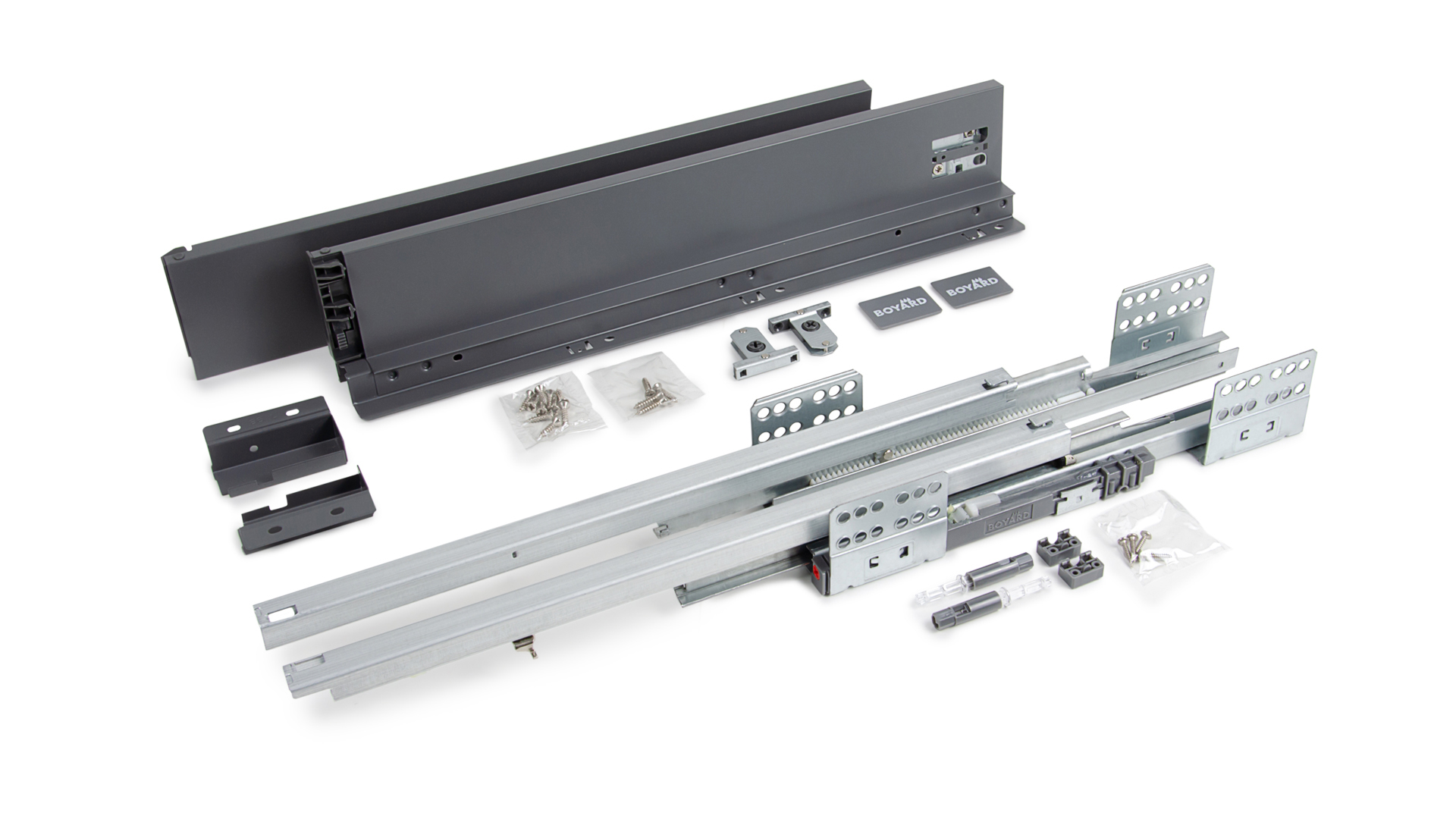 Комплект SB28 включает в себя: направляющие (левая и правая), детали для установки трубки синхронизации с крепежом, держатели задней стенки, традиционные боковые стенки, фиксаторы фасада, заглушки, крепёж.