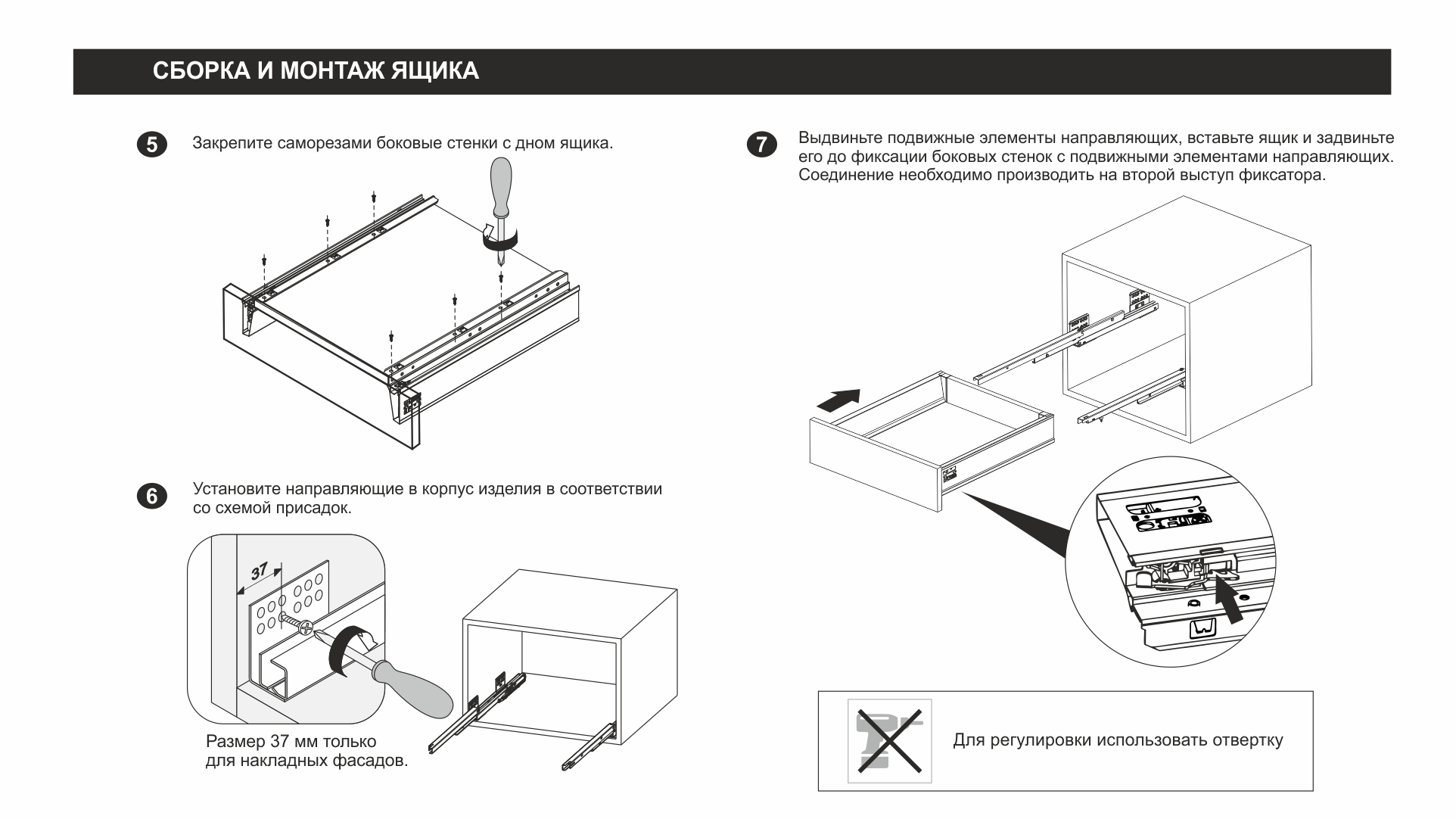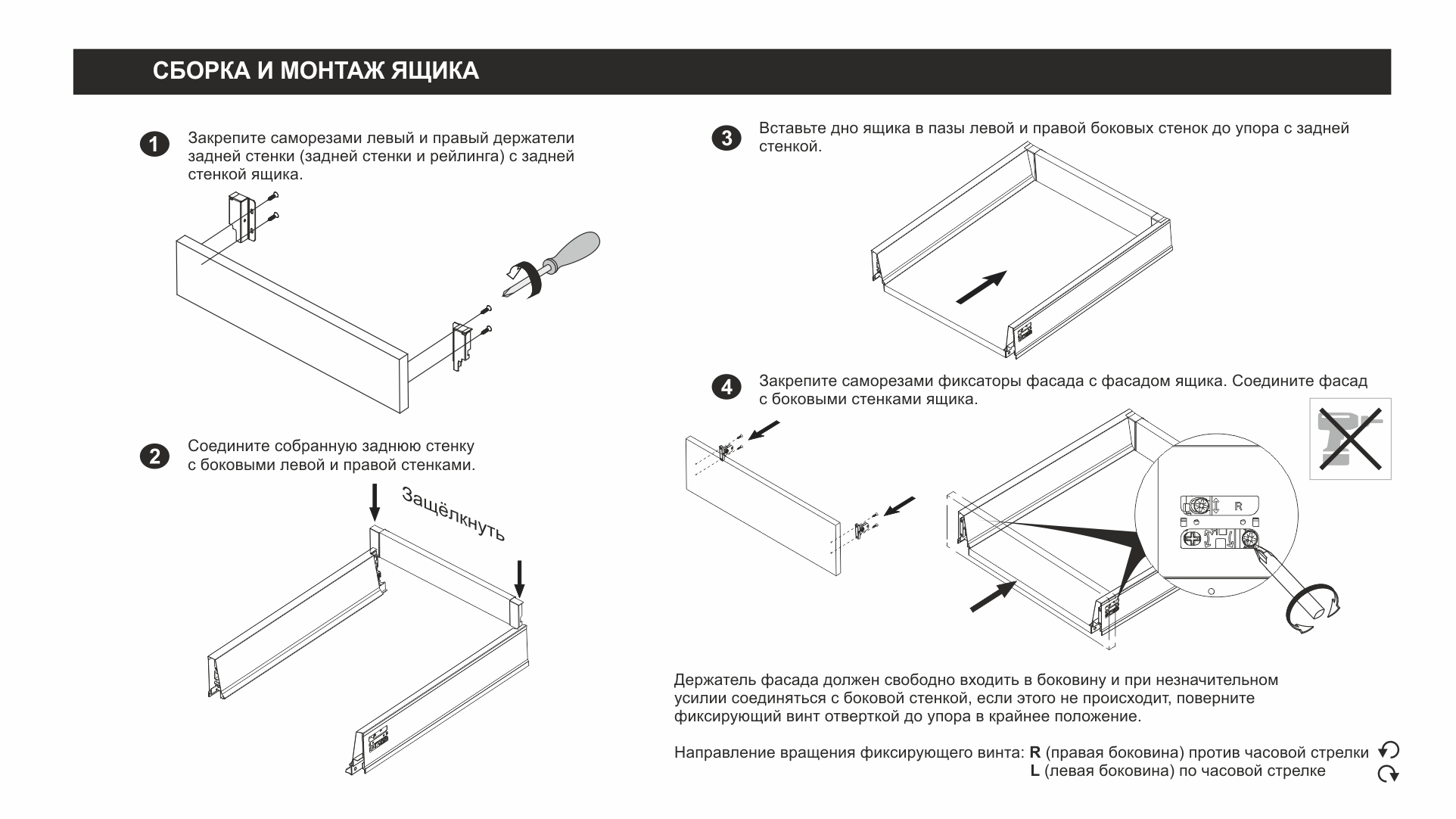 Для сборки выдвижного мебельного ящика на базе СТАРТ PUSH SB28 необходимо самостоятельно изготовить фасад, заднюю стенку и дно ящика.